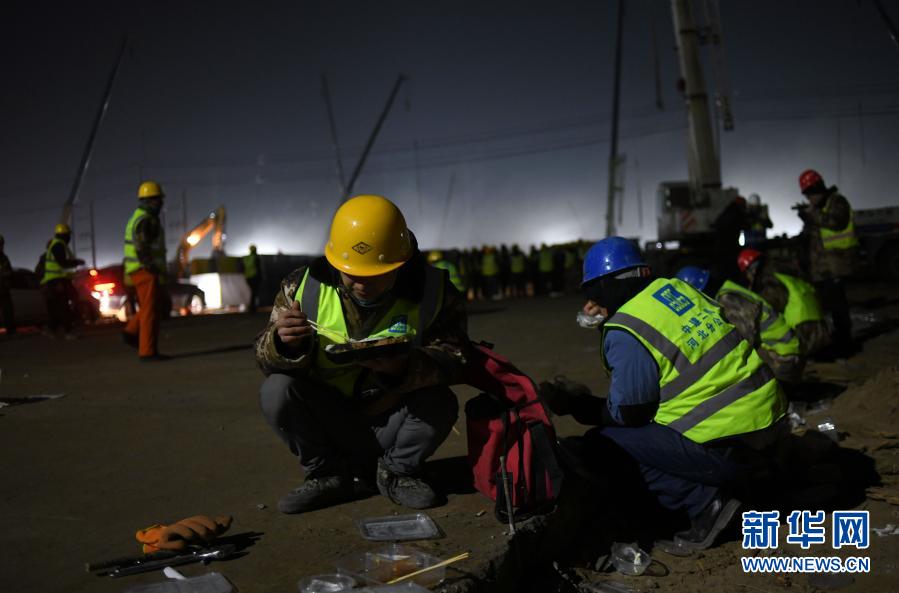 1月16日,代斌(前左)在石家庄黄庄公寓隔离场所项目工地吃饭。