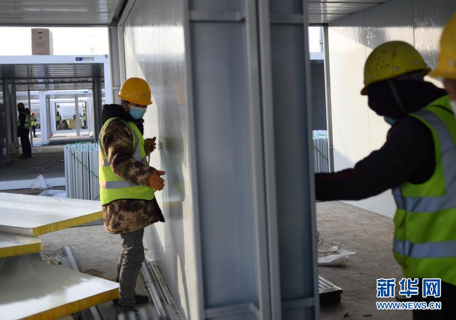 1月16日,代斌(左)在石家庄黄庄公寓隔离场所项目工地施工。