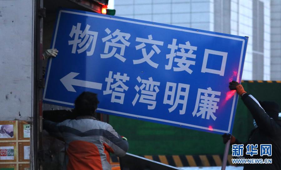 1月17日早晨,工作人员在昆山西路塔湾街将管控期间使用的交通标志装车运走。新华社记者 姚剑锋 摄
