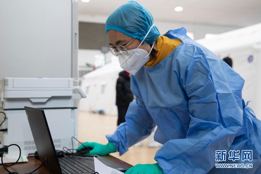 1月17日,工作人员在望奎县移动方舱检测实验室进行数据登记。