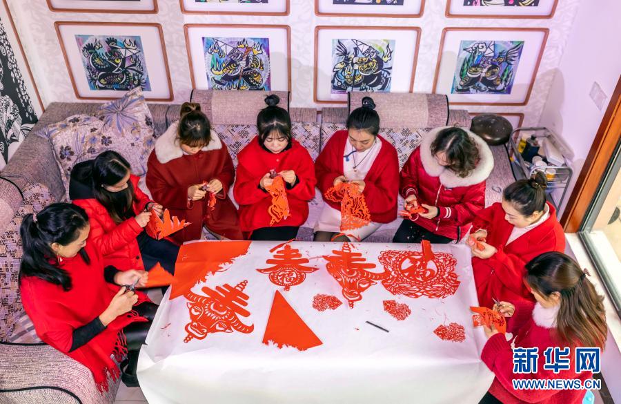 1月17日,岳红霞(右四)带领工作室学员创作“金牛送福”剪纸。