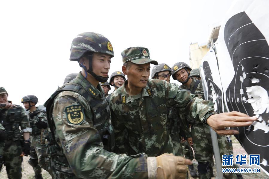 武警猎鹰突击队支队长米彦广(前右一)在训练场与战友探讨射击技巧(2018年4月28日摄)。新华社发(杨志毅 摄)