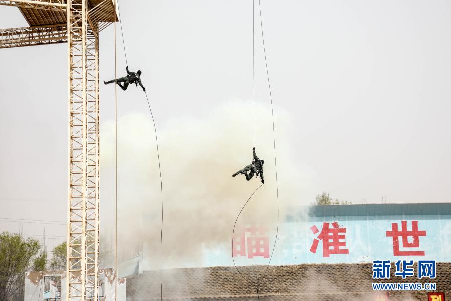 在模拟反恐演练中,武警猎鹰突击队特战队员完成突击任务后,高空索降撤离(2019年4月4日摄)。新华社发(杨志毅 摄)