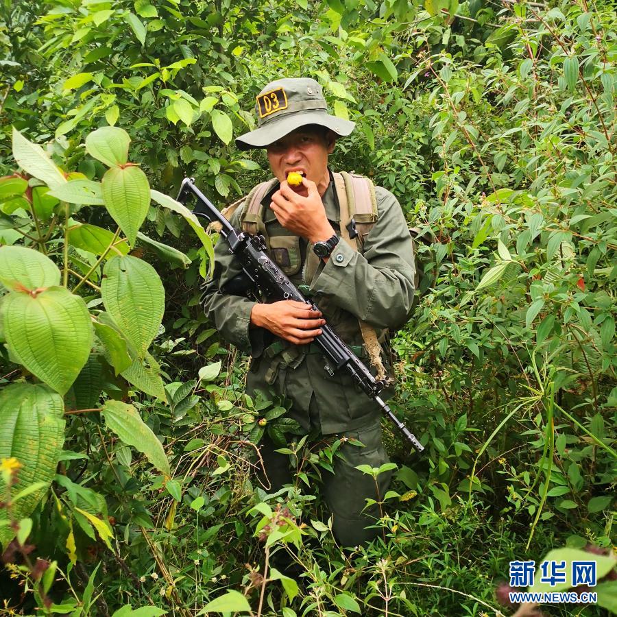 在委内瑞拉“猎人学校”训练时,武警猎鹰突击队特战队员杨振在热带雨林巡逻途中用野果充饥(2019年12月14日摄)。新华社发