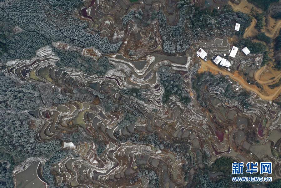 1月17日拍摄的广西融水苗族自治县杆洞乡党鸠村乌英苗寨的雪景(无人机照片)。