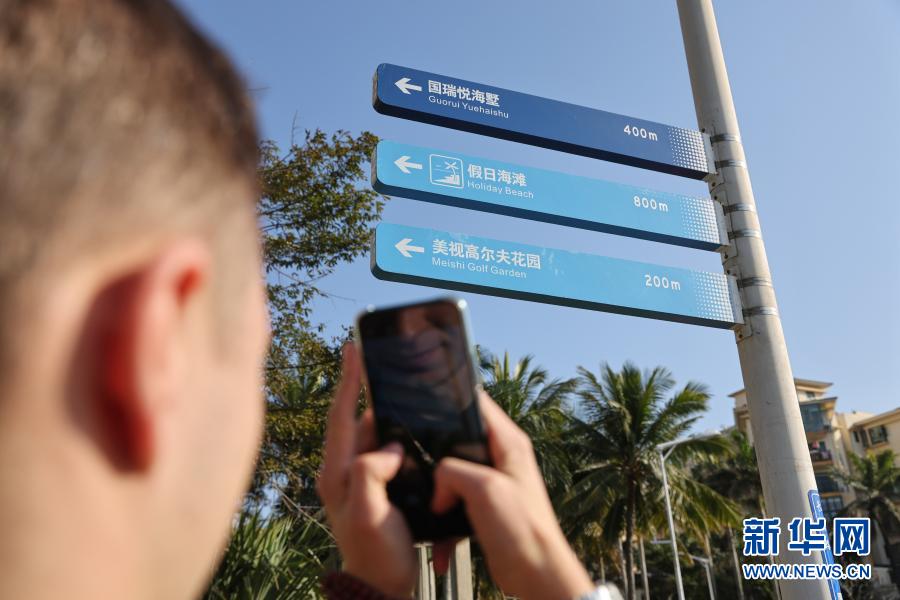 1月14日,亚历克斯在拍摄路边的标识牌。新华社记者 张丽芸 摄