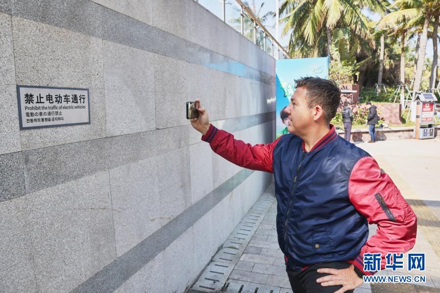 1月13日,汤米在拍摄路边的标识牌。新华社记者 张丽芸 摄