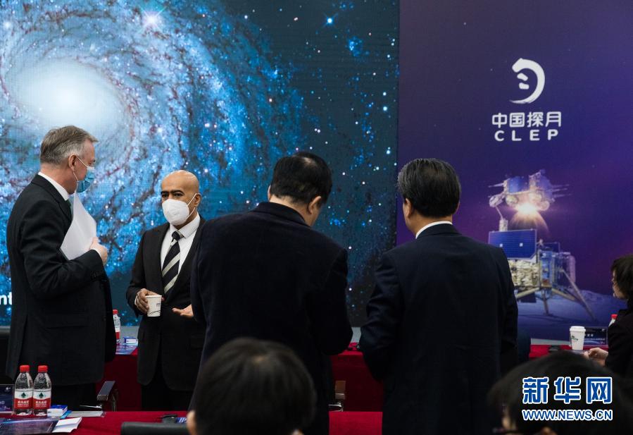 1月18日,外国驻华使馆及国际组织人员在中科院国家天文台参观嫦娥五号任务航天器模型和实物时交流。新华社记者 金立旺 摄