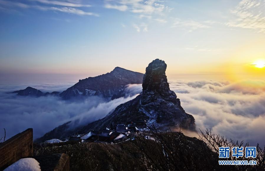 1月17日在贵州铜仁梵净山拍摄的夕阳云海景观。新华社发(李鹤 摄)