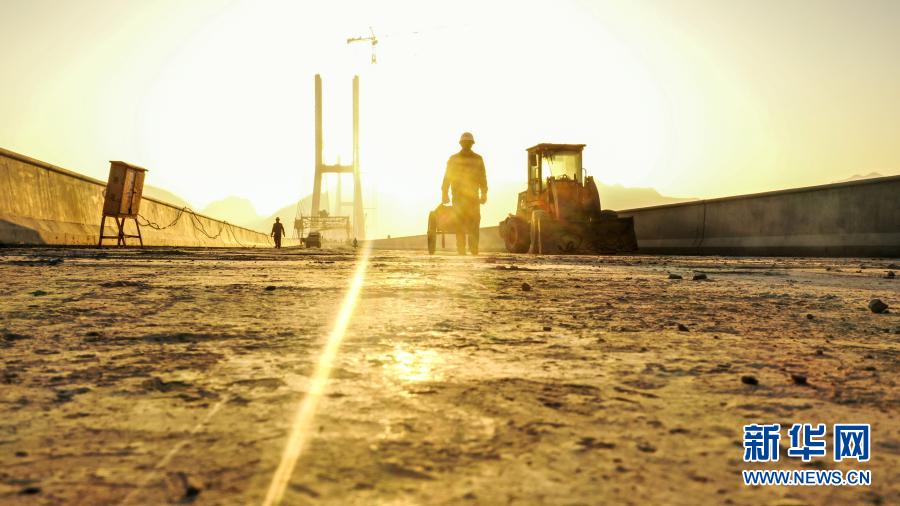 1月18日,工人在贵州都安高速公路云雾大桥上施工(无人机照片)。
