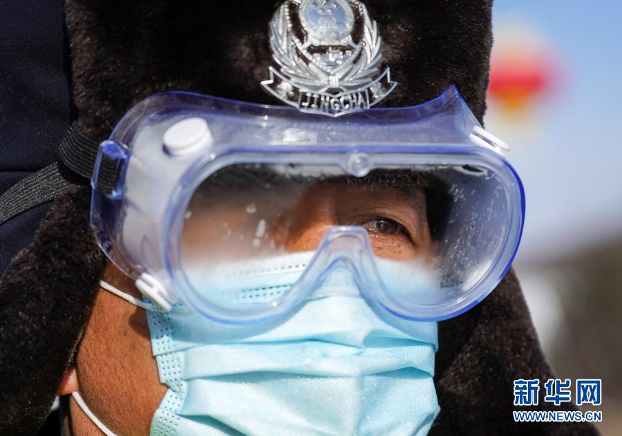 1月18日,通化市交警支队公路巡警一大队民警赵铁军在重点路口执勤,对出城车辆、人员进行检查。新华社记者 许畅 摄
