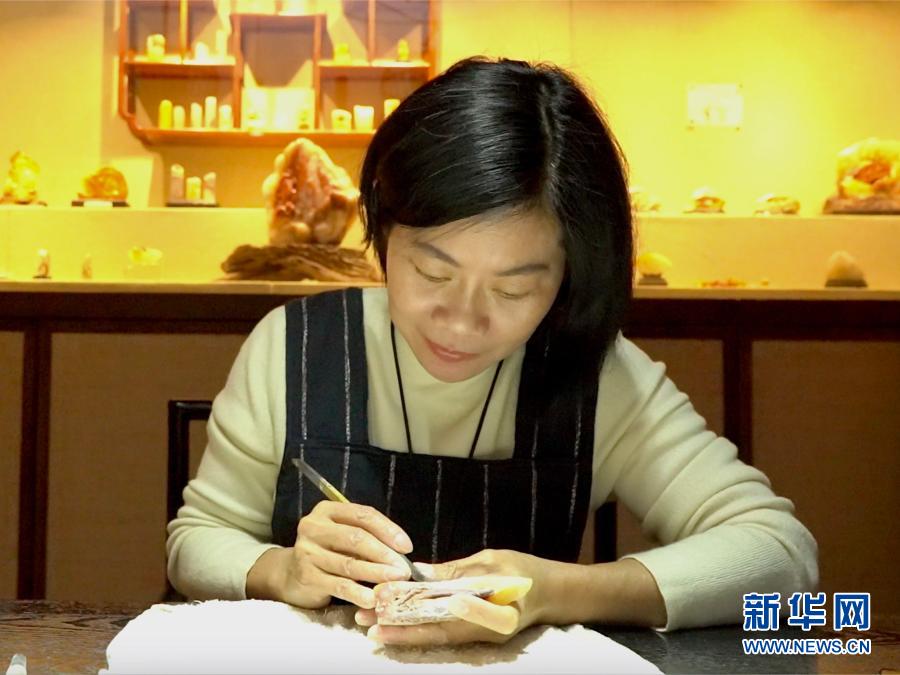 寿山石雕刻师叶子在进行寿山石雕刻(2020年12月10日摄)。新华社记者 褚萌萌 摄