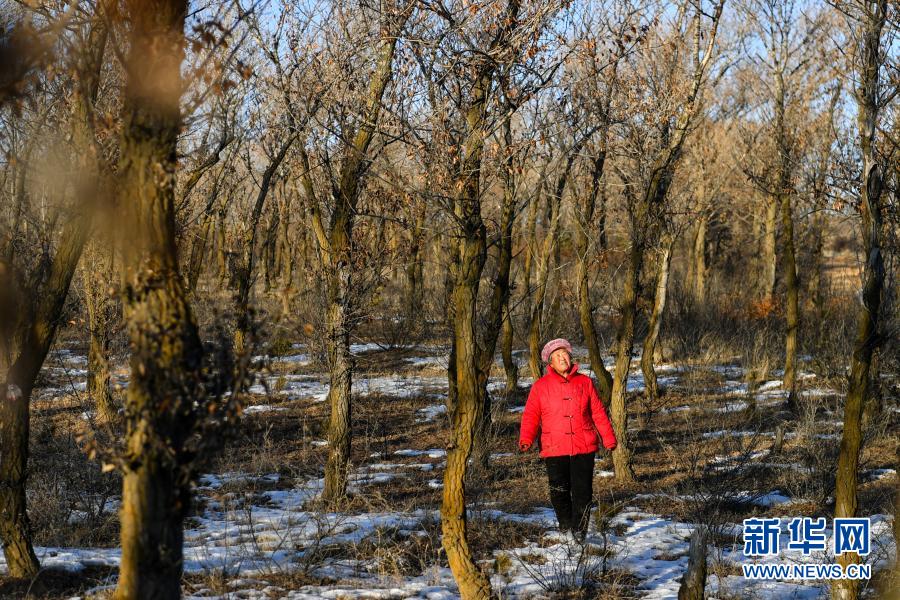右玉县头水泉村党支部书记王明花在黄沙洼查看树的生长情况(2020年12月29日摄)。新华社记者 曹阳 摄