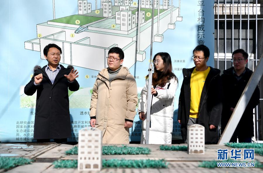 1月12日,侯精明(左一)与研究生在西安理工大学海绵城市模型前进行讨论。新华社记者 刘潇 摄