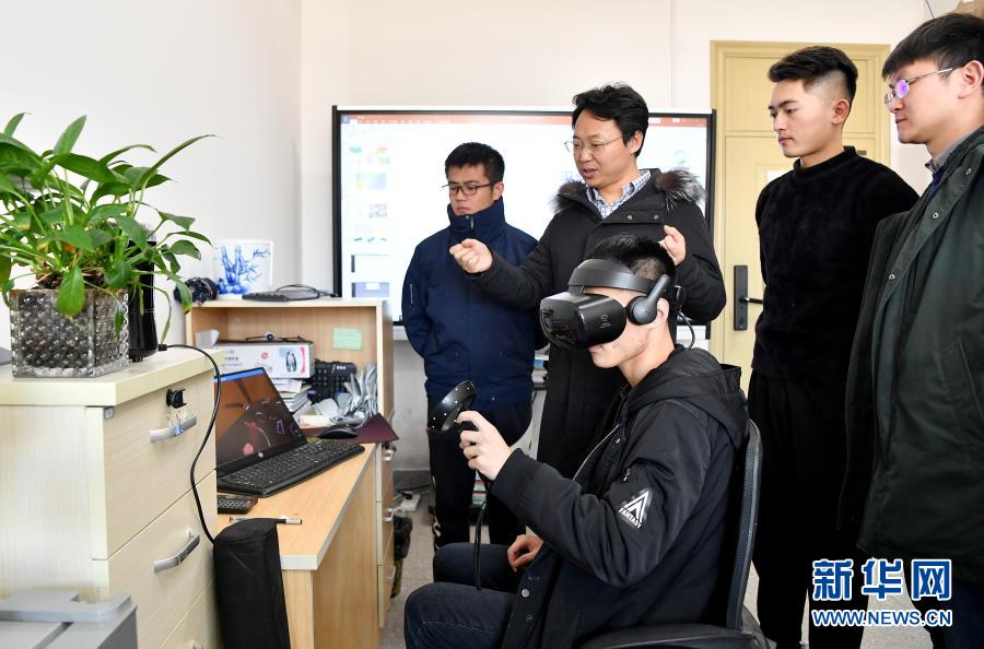 1月12日,侯精明(后左二)在西安理工大学与研究生一起观看VR城市内涝模拟演示。新华社记者 刘潇 摄