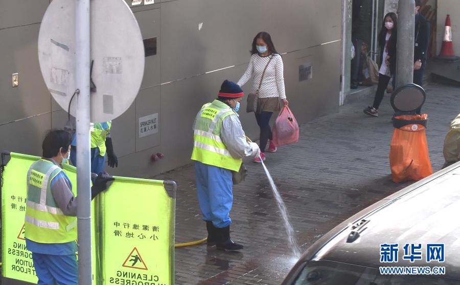 1月18日,清洁人员在香港街头清洗道路。新华社记者 卢炳辉 摄
