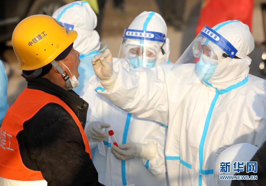 当日,河北石家庄黄庄公寓隔离场所项目建设工地进行全员核酸检测。