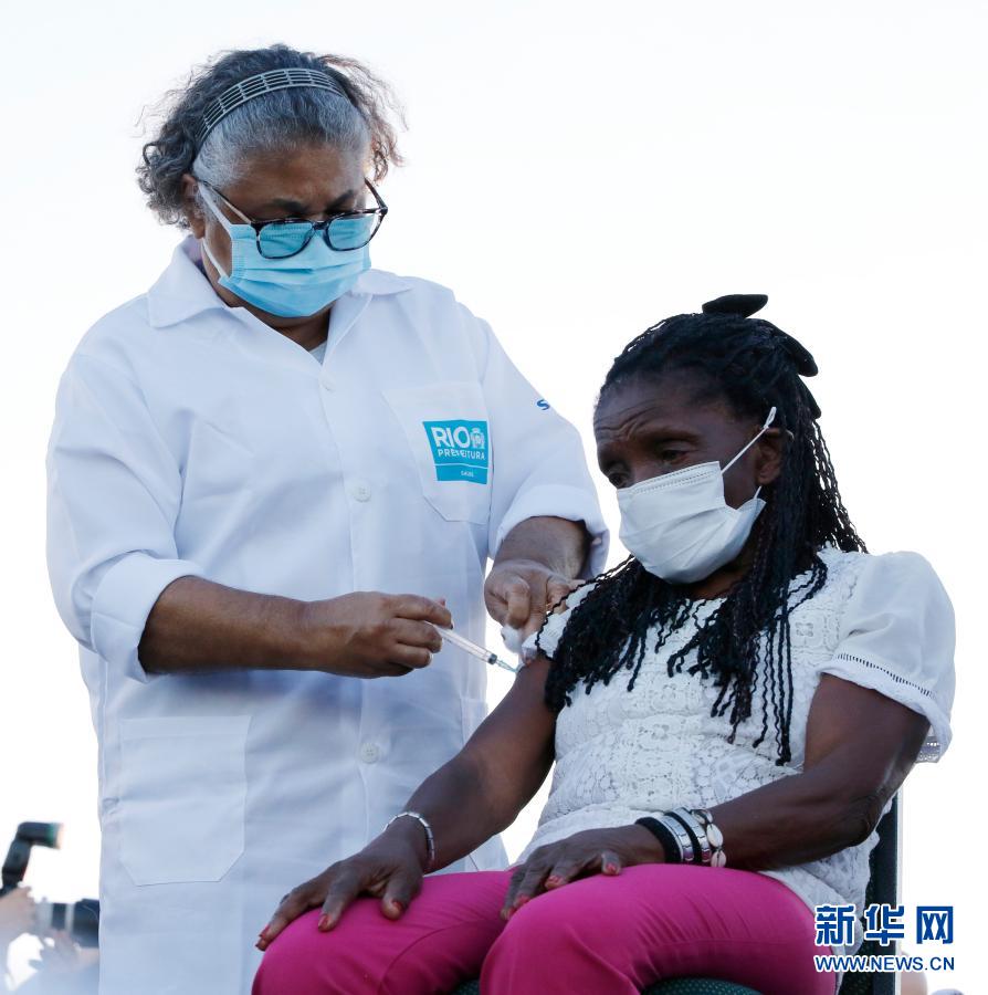 1月18日,在巴西里约热内卢,一家福利院的80岁老人特雷济尼亚·达孔塞桑(右)在接种中国新冠疫苗。新华社发(巴西国家通讯社供图)