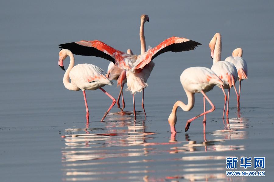 1月18日,在科威特首都科威特城,成群的火烈鸟在觅食。