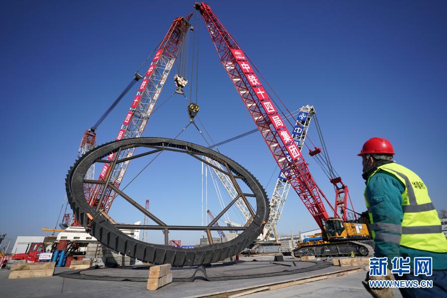 在北京城市副中心东六环路改造工程施工现场,施工人员在吊装盾构机使用的洞门钢环(2020年12月25日摄)。新华社记者鞠焕宗摄