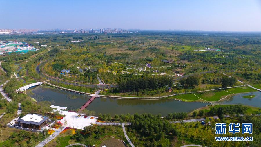这是2020年9月30日拍摄的位于北京市通州区的城市绿心森林公园(无人机照片)。新华社发(刘宇 摄)