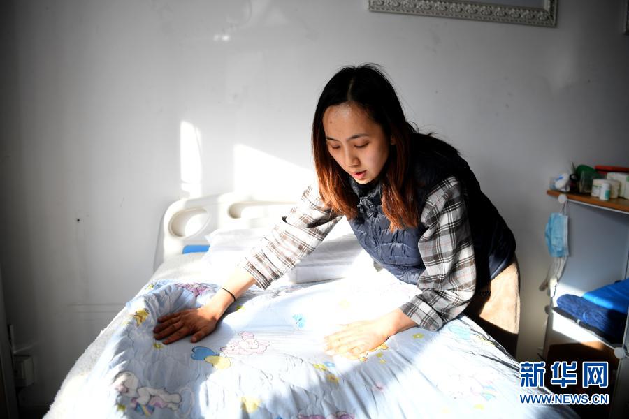 1月13日,刘宁在给男友彭亚楼收拾床铺。