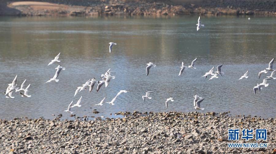1月18日,在甘肃省临夏回族自治州永靖县刘家峡镇,红嘴鸥在水面上飞翔。新华社发(史有东 摄)