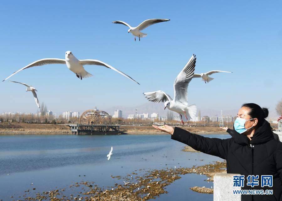1月18日,在甘肃省临夏回族自治州永靖县刘家峡镇,居民给红嘴鸥喂食。新华社发(史有东 摄)