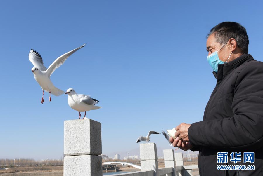 1月18日,在甘肃省临夏回族自治州永靖县刘家峡镇黄河岸边,居民给红嘴鸥喂食。新华社发(史有东 摄)