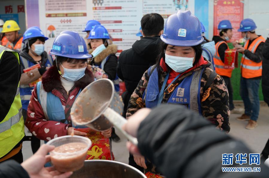 当日,中建二局组织志愿者在湖南省长沙市岳麓区一建筑工地内,为工人准备熬制好的腊八粥,并向工人赠送春联、贴纸等节日用品。