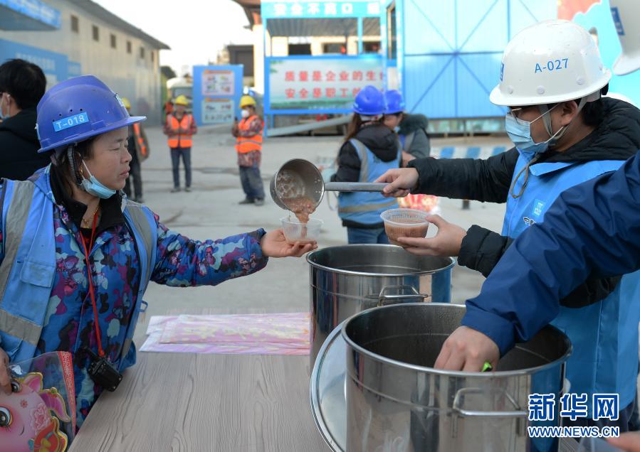 当日,中建二局组织志愿者在湖南省长沙市岳麓区一建筑工地内,为工人准备熬制好的腊八粥,并向工人赠送春联、贴纸等节日用品。