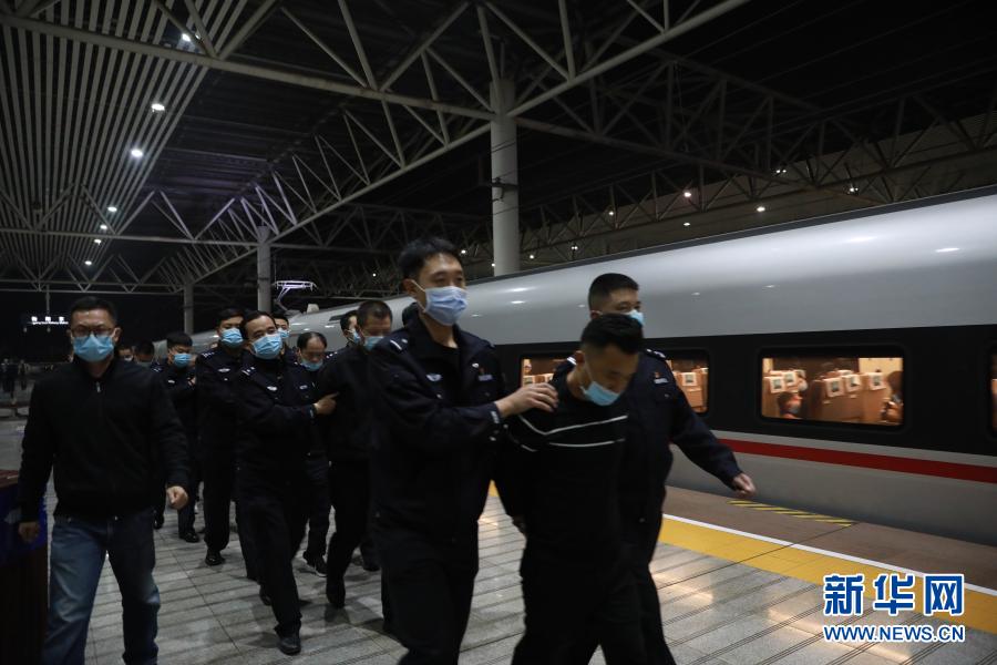 广州铁路公安局衡阳公安处民警在衡阳东高铁站接到南昌铁路公安局抓获后转送过来的6名涉嫌诈骗的犯罪嫌疑人(2020年11月12日摄)。新华社发(莫玉鑫 摄)