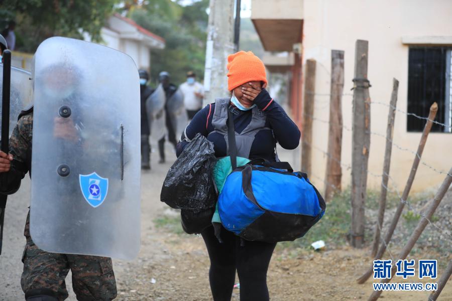 1月18日,在危地马拉奇基穆拉省靠近洪都拉斯的边境小镇巴多翁多,一名被阻的中美洲移民女子掩面哭泣。