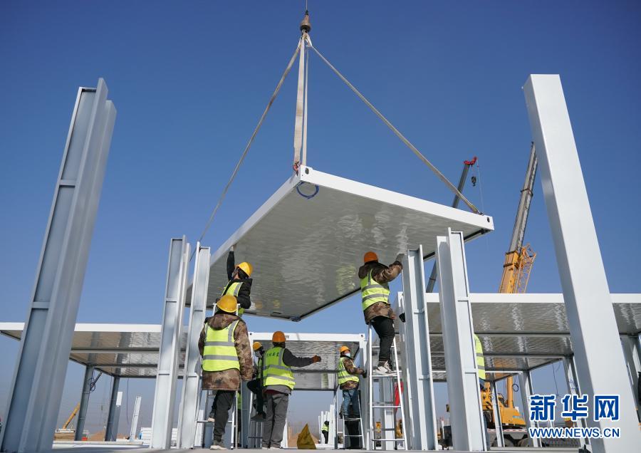 1月18日,工人在石家庄市黄庄公寓隔离场所项目工地安装集成房屋。新华社记者 杨世尧 摄