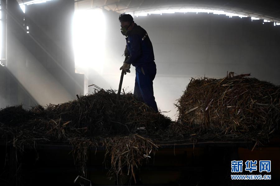 1月19日,在广西柳州市柳城县一家新能源科技公司,工人把回收的甘蔗叶推入粉碎车间。