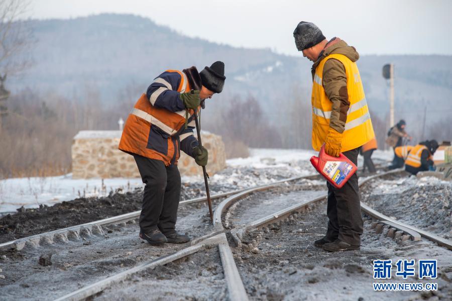1月11日,漠河道岔维修工队工长杨玉海(左)和工友对漠河站的道岔进行养护作业。