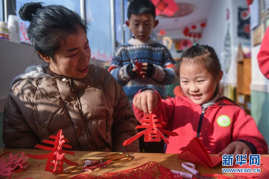 1月20日,长兴县李家巷镇中心幼儿园的老师带着孩子们剪“春”字窗花。