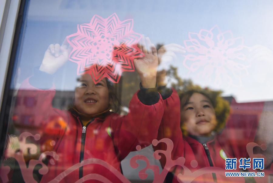 1月20日,长兴县李家巷镇中心幼儿园的孩子们在贴迎春窗花。