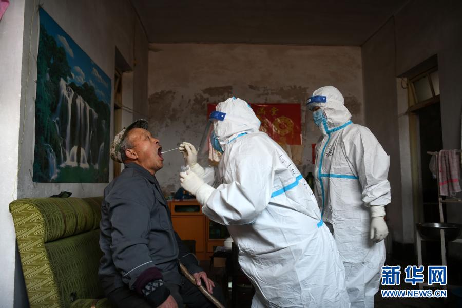 1月20日,在石家庄市井陉县白王庄村,医护人员入户为行动不便的村民进行核酸采样。