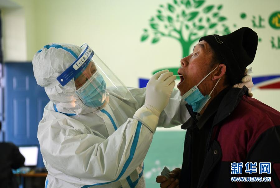 1月20日,石家庄市井陉县白王庄村村民接受核酸采样。