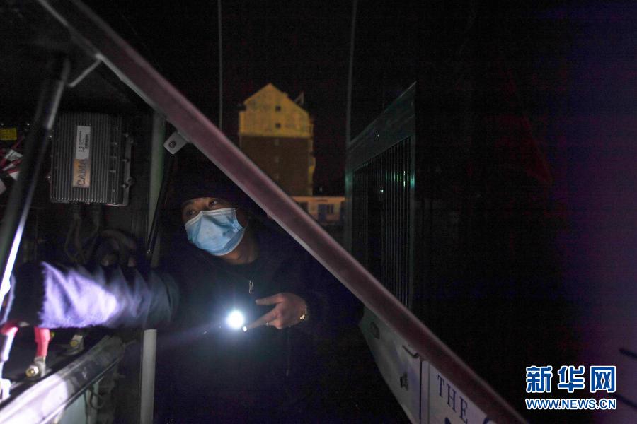 1月20日凌晨,在长春公交集团北达汽车公司雁鸣湖公交枢纽站,守夜班组成员杨洪锁检查车辆状态。
