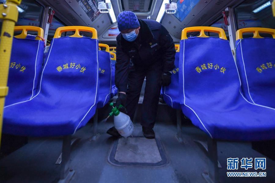 1月20日凌晨,在长春公交集团北达汽车公司雁鸣湖公交枢纽站,王云江在车厢里喷洒消毒水。