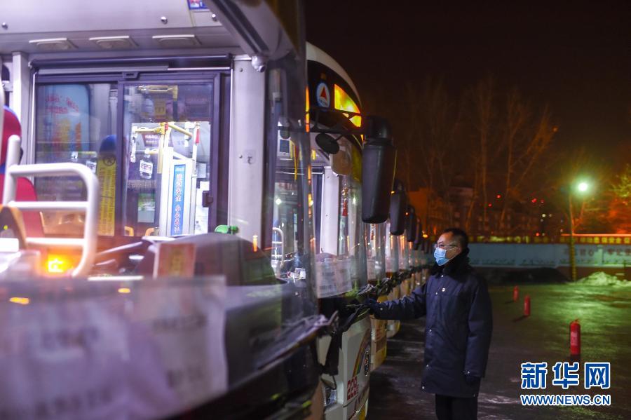 1月20日凌晨,在长春公交集团北达汽车公司雁鸣湖公交枢纽站,队长陈雷检查车辆状态。
