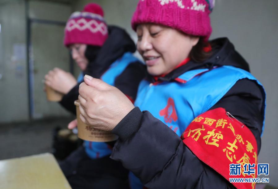 1月20日,在沈阳市和平区浑河站西街道下河湾村,“盛京义勇”疫情防控志愿者在品尝街道工作人员送来的腊八粥。新华社记者 杨青 摄