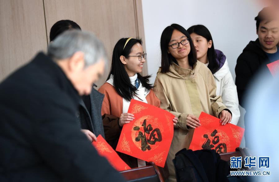 1月19日,家住河北石家庄的陕西师范大学留校学生在学校为他们举办的新春送祝福对联书写活动上。