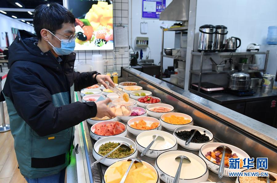 1月19日,陕西师范大学历史文化学院博士研究生吴小龙在学校食堂挑选水果。吴小龙来自河北保定,寒假期间,决定留校就地过年,准备博士论文选题。