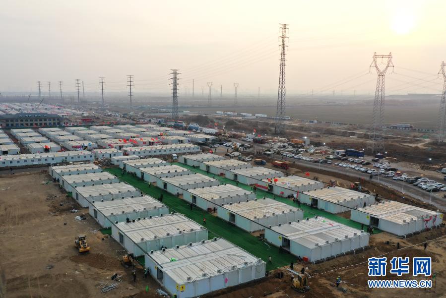 1月19日,在河北省石家庄市黄庄公寓集中隔离场所工地,工人在整理准备交付房屋的地面(无人机照片)。新华社记者 杨世尧 摄