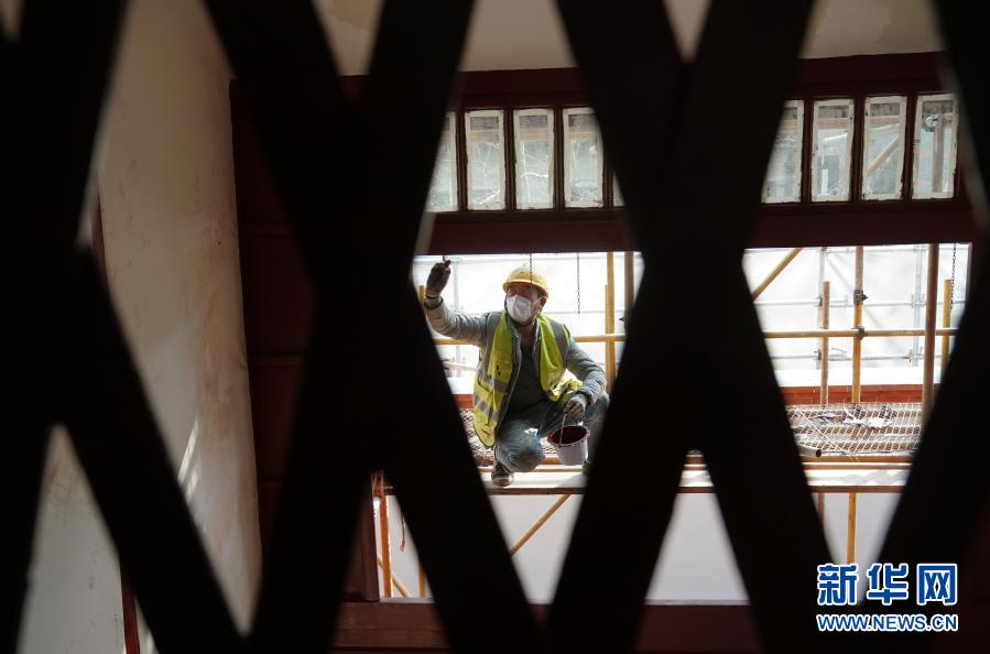 2021年1月14日,工人在修缮现场施工。2020年11月17日起,中共一大会址及原展厅暂停对外开放实施修缮改造。新华社记者 刘颖 摄
