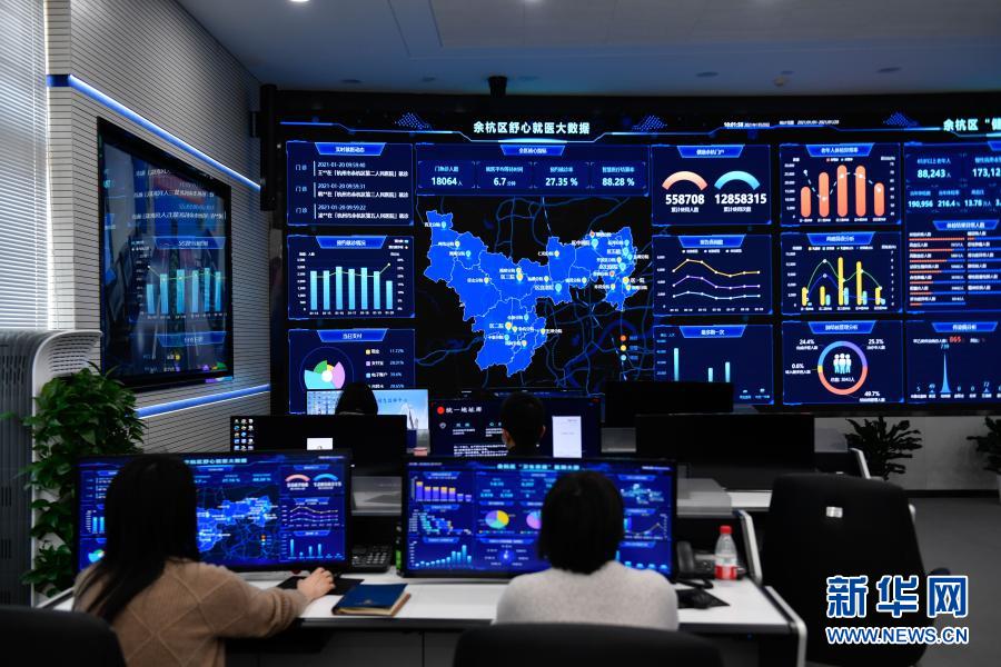 1月20日,在余杭区社会治理综合服务中心,工作人员在关注舒心就医大数据,了解实时就医动态、预约就诊趋势等信息。新华社记者 黄宗治 摄
