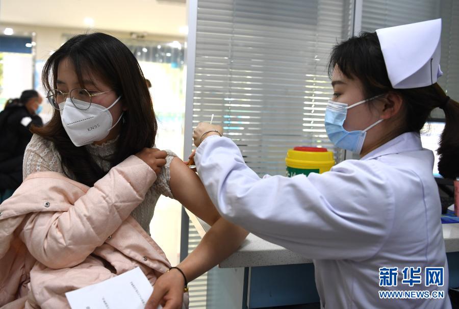 1月20日,在合肥市肥西县上派镇中心卫生院预防接种门诊,医护人员为接种人员注射疫苗。